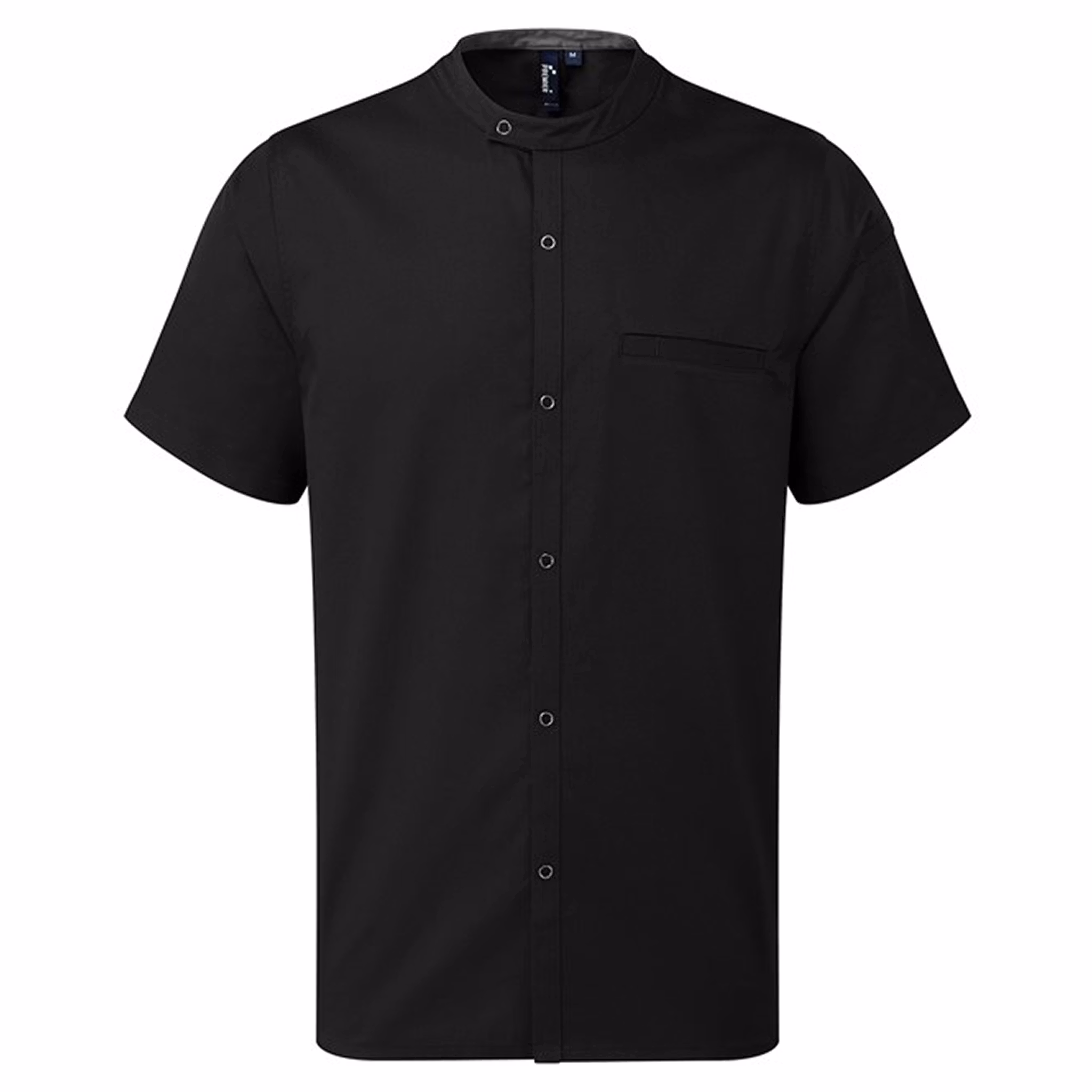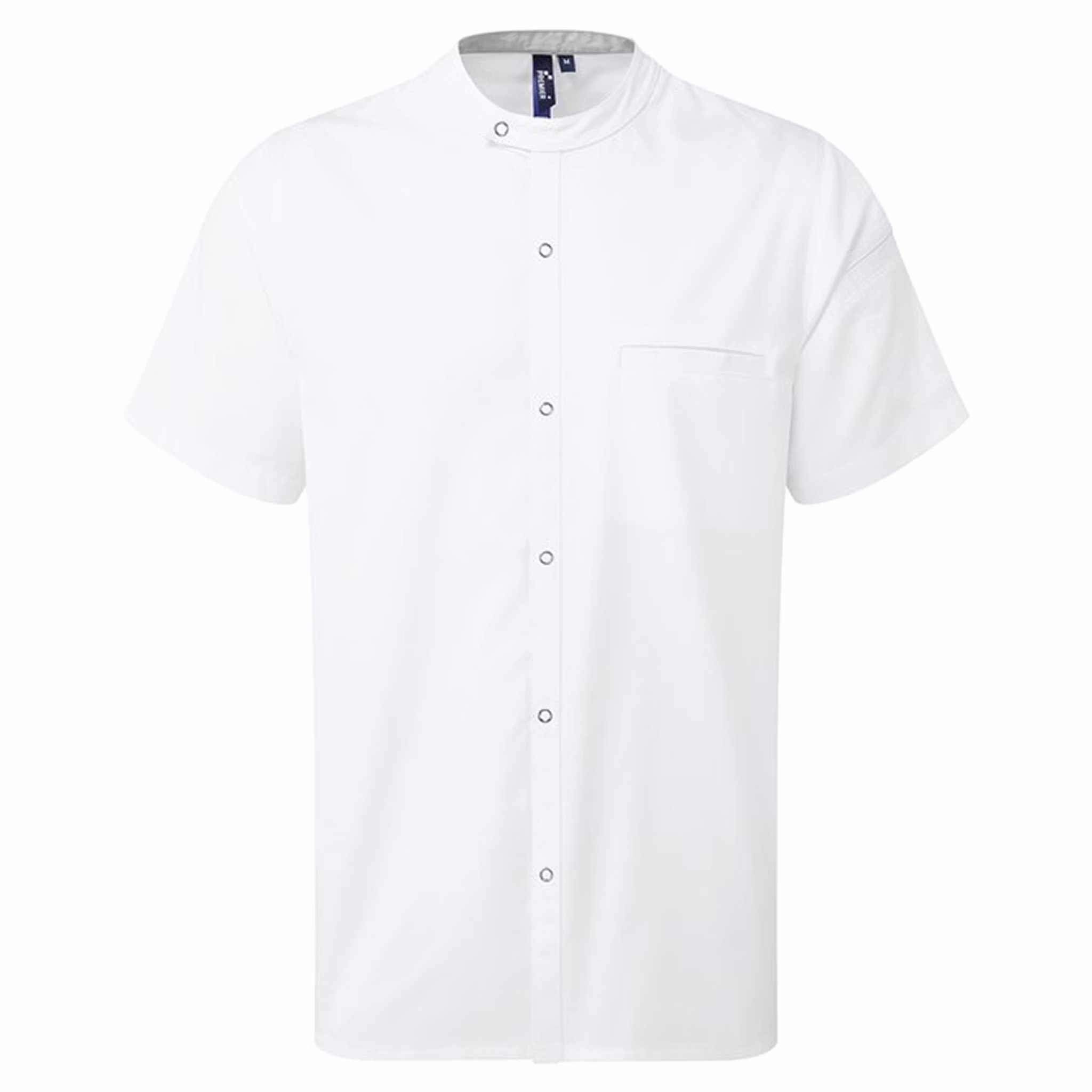 Modern och lätt kockskjorta i återvunnet material, som kombinerar hållbarheten hos en kockjacka med den lätta känslan av en skjorta. Skjortan har kort ärm, asymmetrisk mandarinkrage, tryckknappar framtill och kontrastfärgad innerkrage som döljer vardagsslitage. Med pennfickor på vänster ärm, bröstficka med kombinerad pennhållare och förstärkta sidosömmar – perfekt för professionella kök som värdesätter både funktion och hållbarhet.